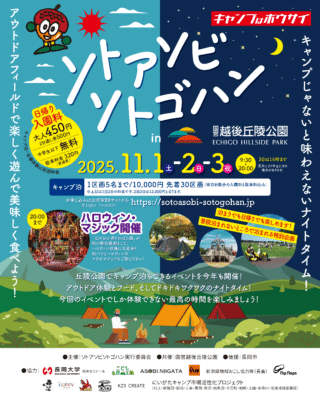 越後丘陵公園の広い芝生で家族でデイキャンプ&キャンプ泊を楽しめるイベント!アウトドア体験とフード、そしてドキドキワクワクのナイトタイム! 今回のイベントでしか体験できない最高の時間を楽しみましょう!