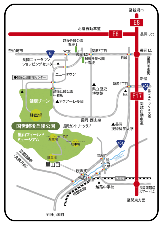 所要時間:ウェルカムゲート約10分、里山口約15分(長岡ICを降り、国道8号を柏崎方面へ)