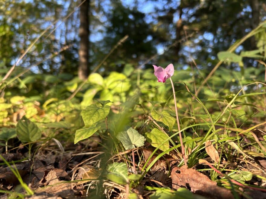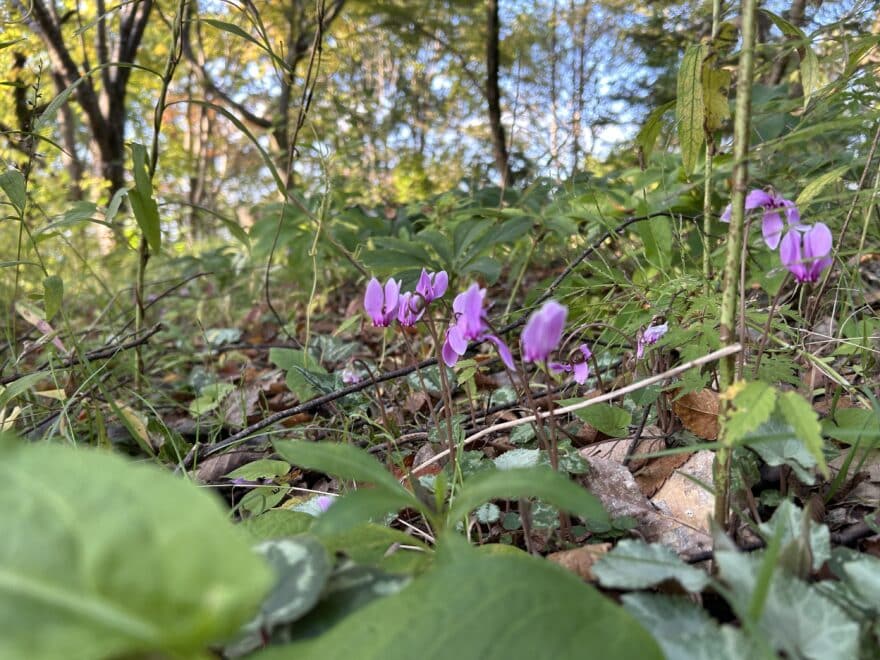 現在、ふれあいの森では原種シクラメン「ヘデリフォリウム」が開花しています。