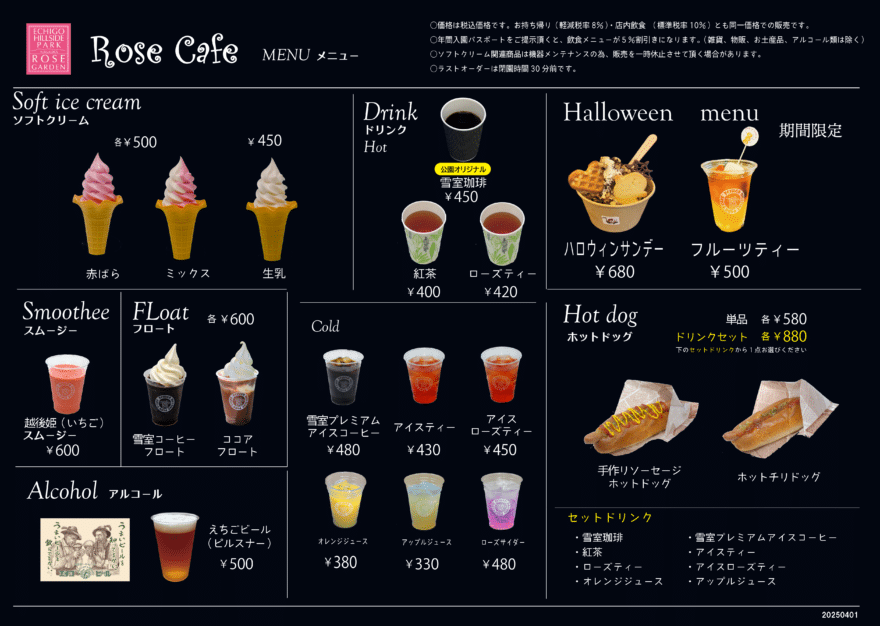 ローズカフェでは、香りのばら園の中で花を愛でながら、軽食や喫茶をお楽しみいただけます。