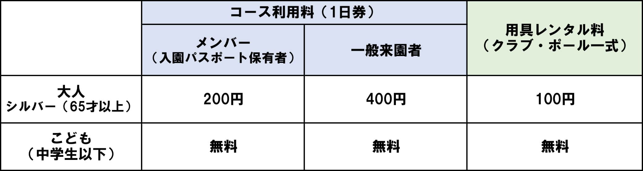 ※※身体障害者手帳または療育手帳、精神障害者保健福祉手帳の交付を受けている方は、手帳の提示があった本人と付き添いの方1名のコース使用料および用具レンタル料が無料となります。
