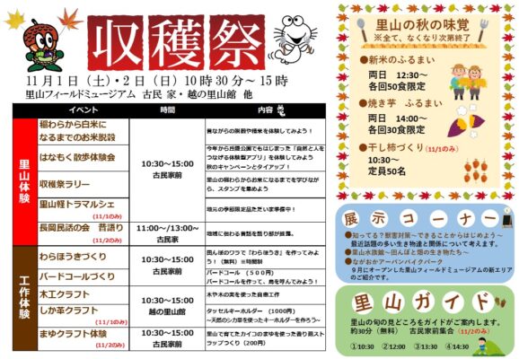 里山での豊作を祝い、新米のふるまいやわら細工づくり、精米体験などを開催します。